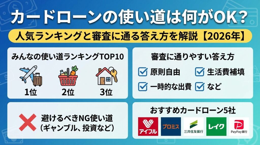 この記事では、実際の利用者の使い道ランキングや、申込時の正しい答え方、避けるべき使い道を詳しく解説します。
