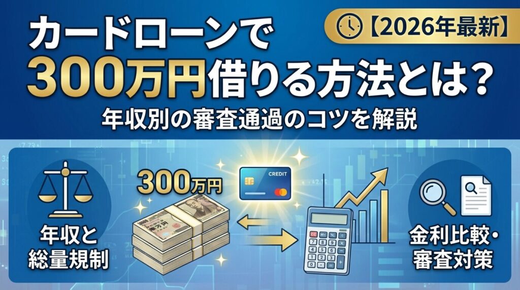 300万円を借りる方法は、カードローンだけでなく目的別ローンやフリーローンなど複数の選択肢があります。消費者金融で300万円を借りるには年収900万円以上が必要ですが、銀行カードローンは総量規制の対象外のため、年収600〜700万円台でも審査次第で借入可能です。