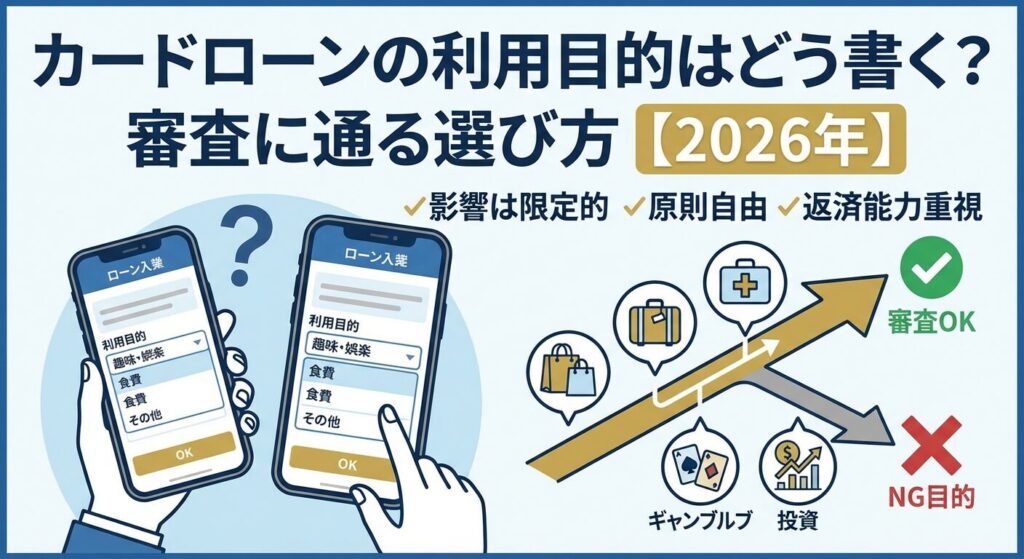 カードローンの申込時に「利用目的」の入力欄を見て、何を選べば審査に通りやすいのか迷っていませんか。