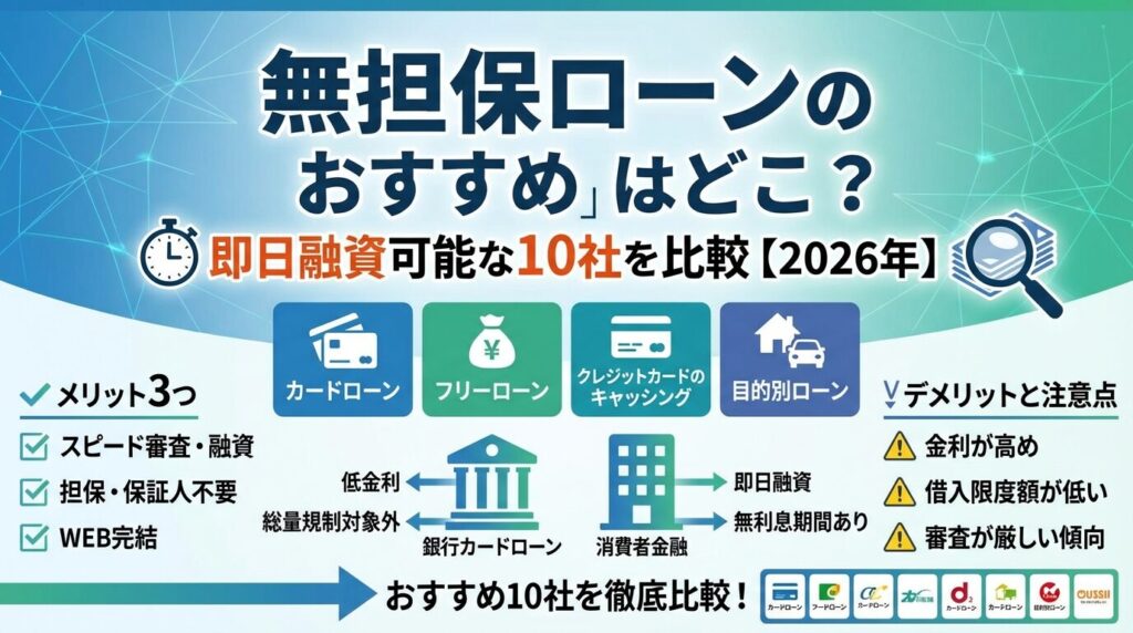 この記事では、無担保ローンの仕組みから銀行カードローンと消費者金融の違い、おすすめの10社比較、審査基準、返済方法まで徹底解説します。