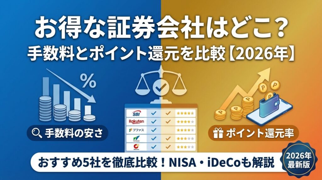 お得な証券会社を選ぶには、手数料、ポイント還元率、取扱商品の3つの視点が重要です。